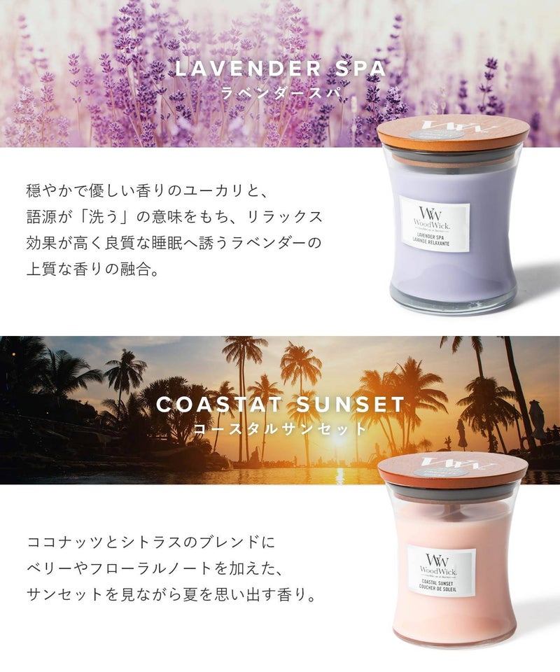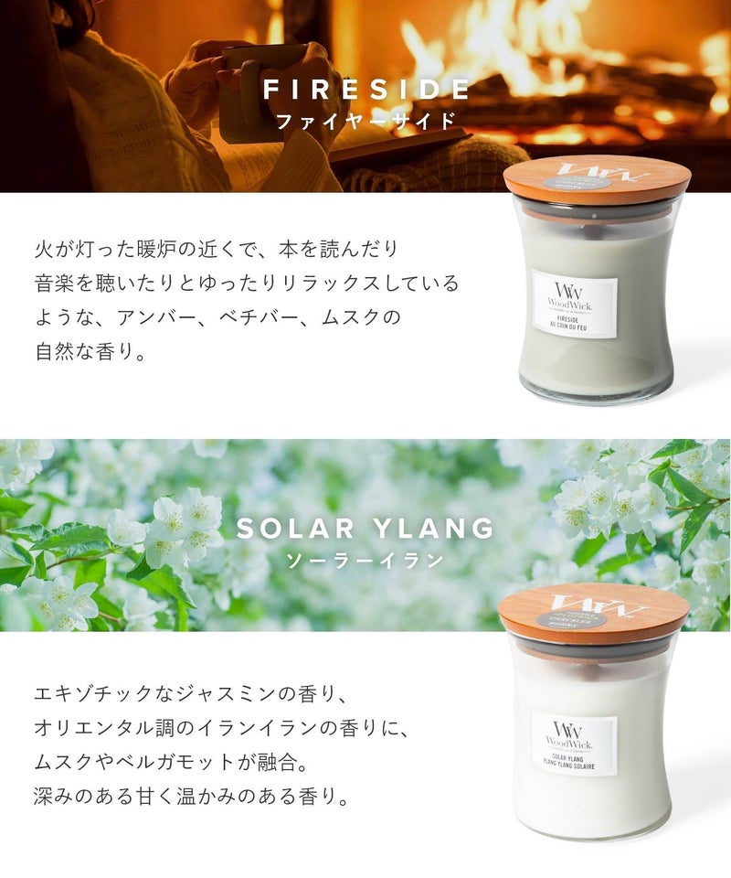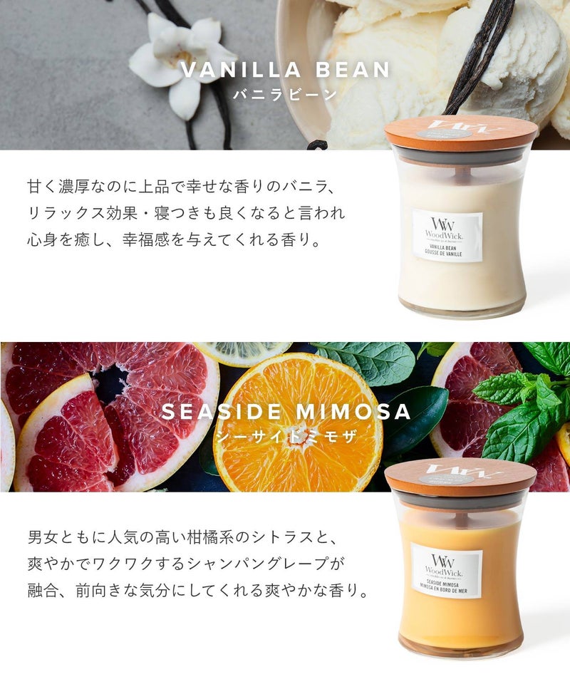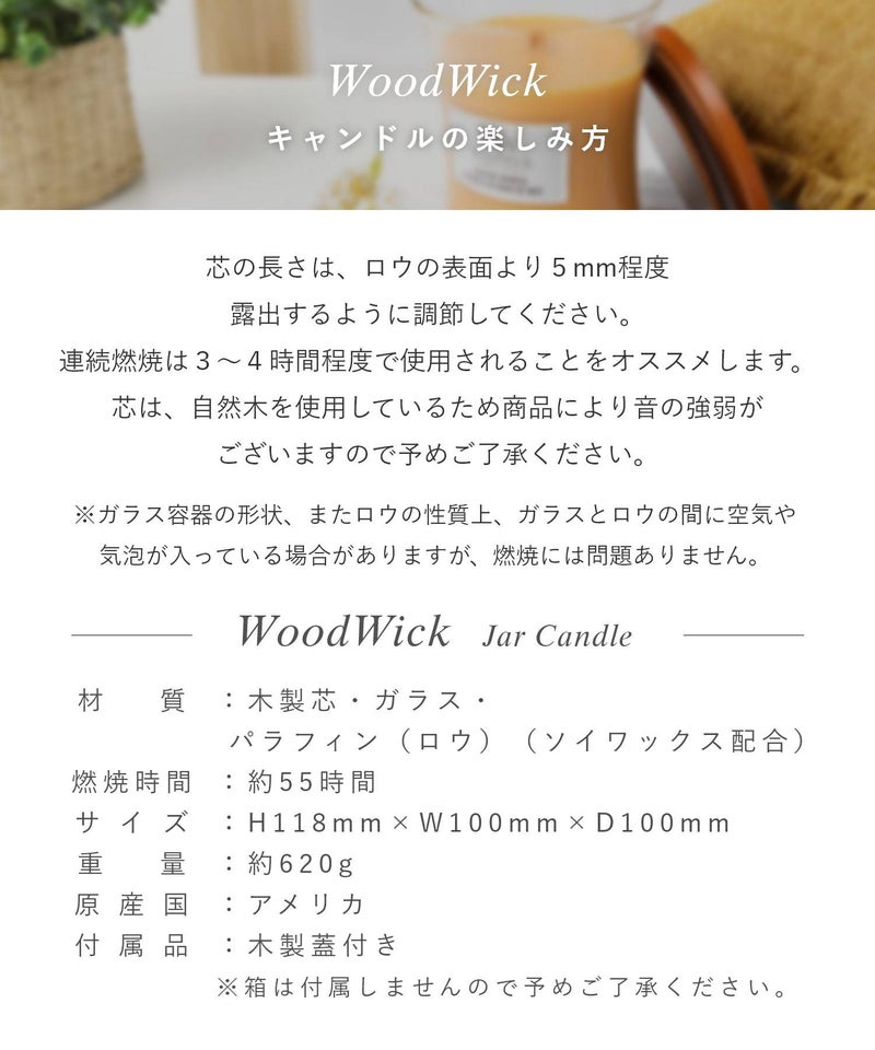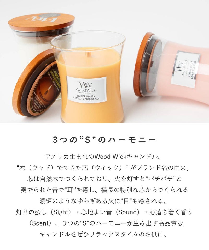 ブランド名は、キャンドルの特徴である「木(ウッド)でできた芯(ウィック)」が由来となっています。火を灯すと暖炉のようにパチパチと音がするキャンドルです。木製芯から聞こえてくる心地よい暖炉のような音と、高品質な香りが、癒しの空間を演出してくれます。自分用にはもちろん、ギフトにもオススメです。