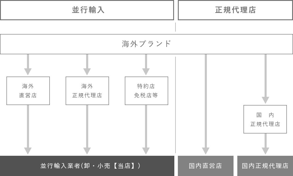 並行輸入とは、国内正規代理店ルートとは別の海外正規代理店を通し真正品を輸入することを指し、海外の有名ブランド品などを海外で購入し、日本の正規代理店以外のルートで輸入することです。輸入ルートにより、価格やサービスなどの条件が変わりますが、製品としては同じものとなります。現在では並行輸入自体が一般的になってきており、海外サイトから個人で購入することも並行輸入になります。国内正規代理店を通さず仕入れることで中間コストによる、販売価格の調整が発生しないため、国内代理店取り扱い商品に比べて価格をお安くご提供させていただいております。